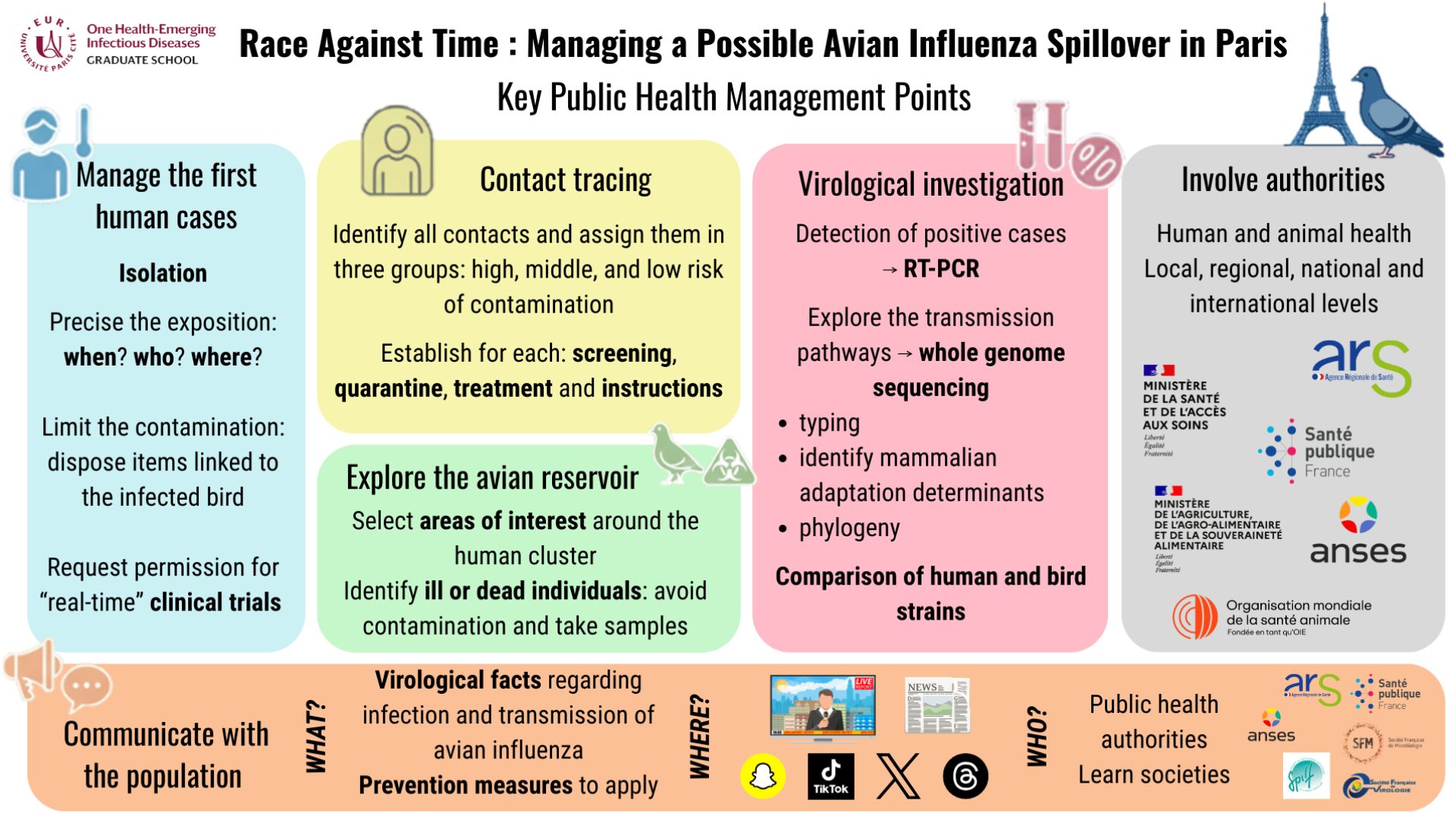 The Graduate School of One Health-Emerging Infectious Diseases* (1H-EID), selected as part of the “Skills and Professions of the Future 2022” call for expressions of interest supported by France 2030, aims to address the challenges of emerging and re-emerging infectious diseases. Its goal is to train public health and biomedical research actors through an integrated approach to animal, human, and environmental health.